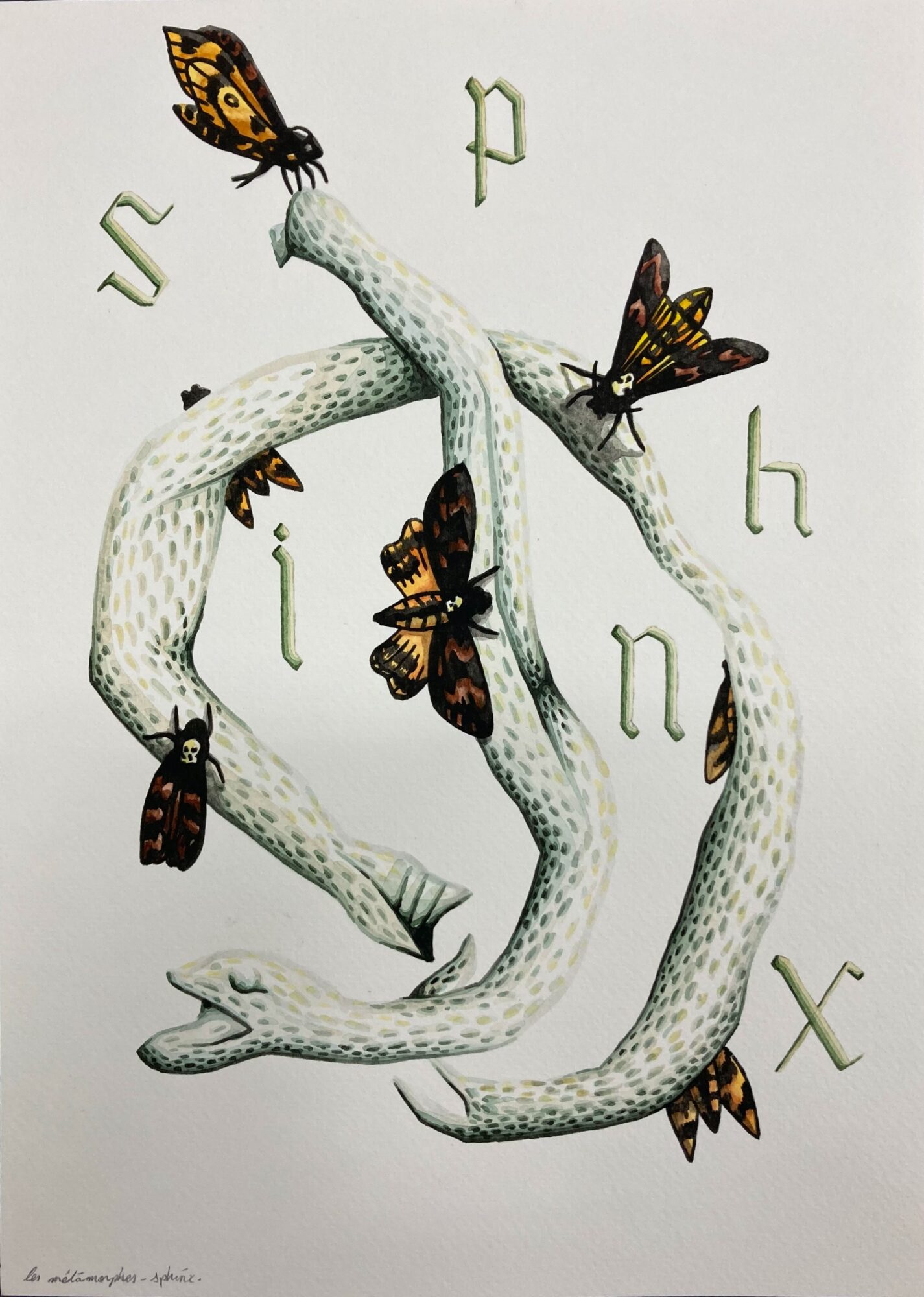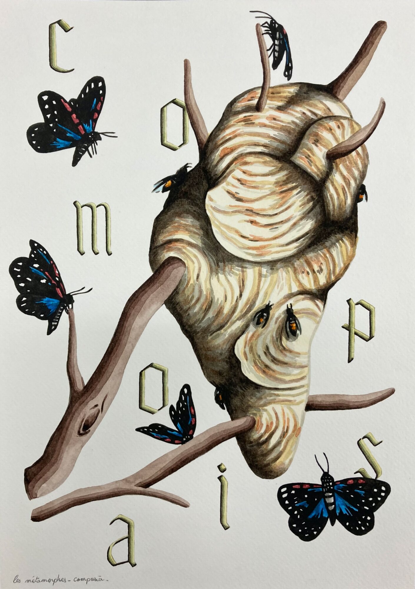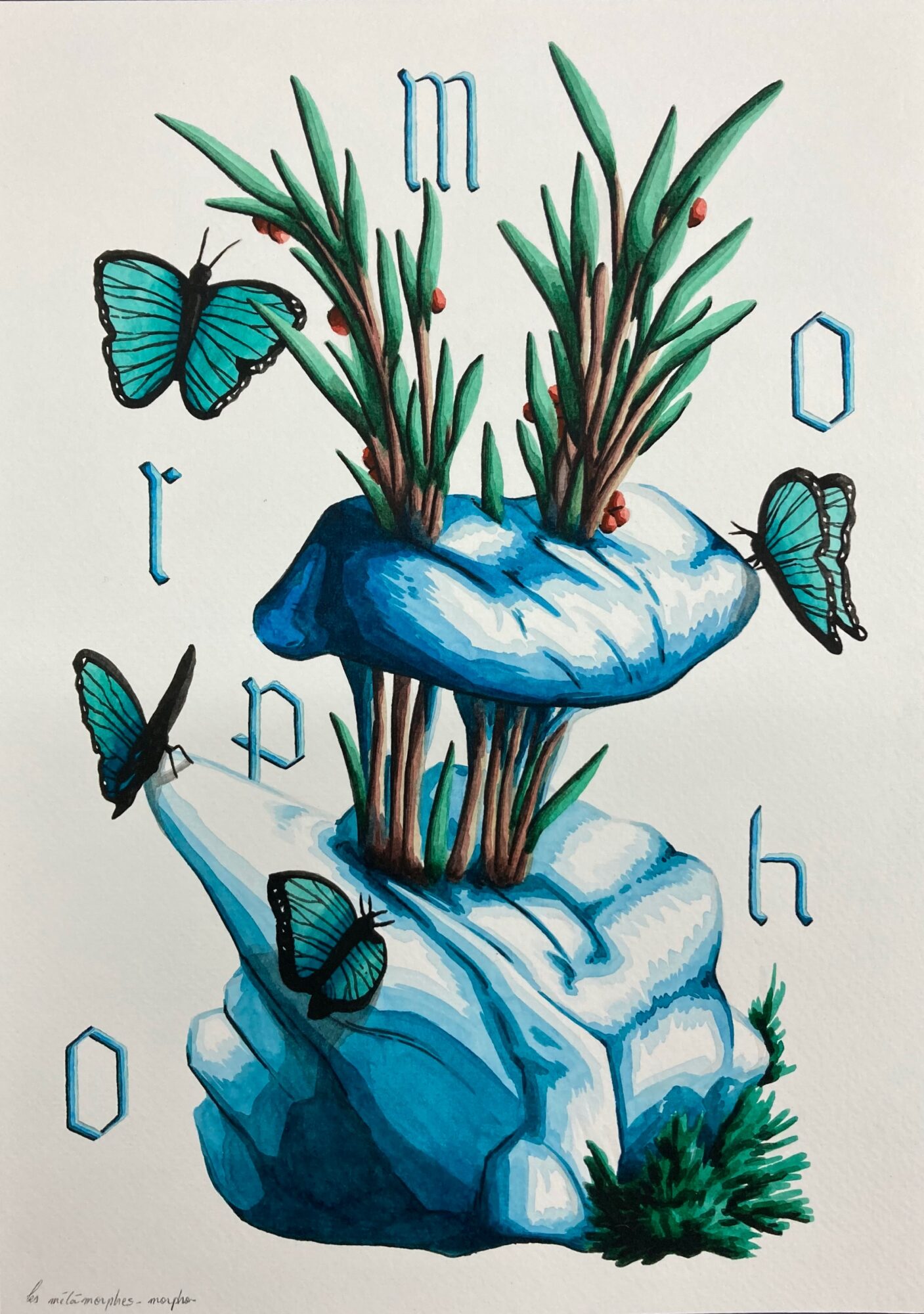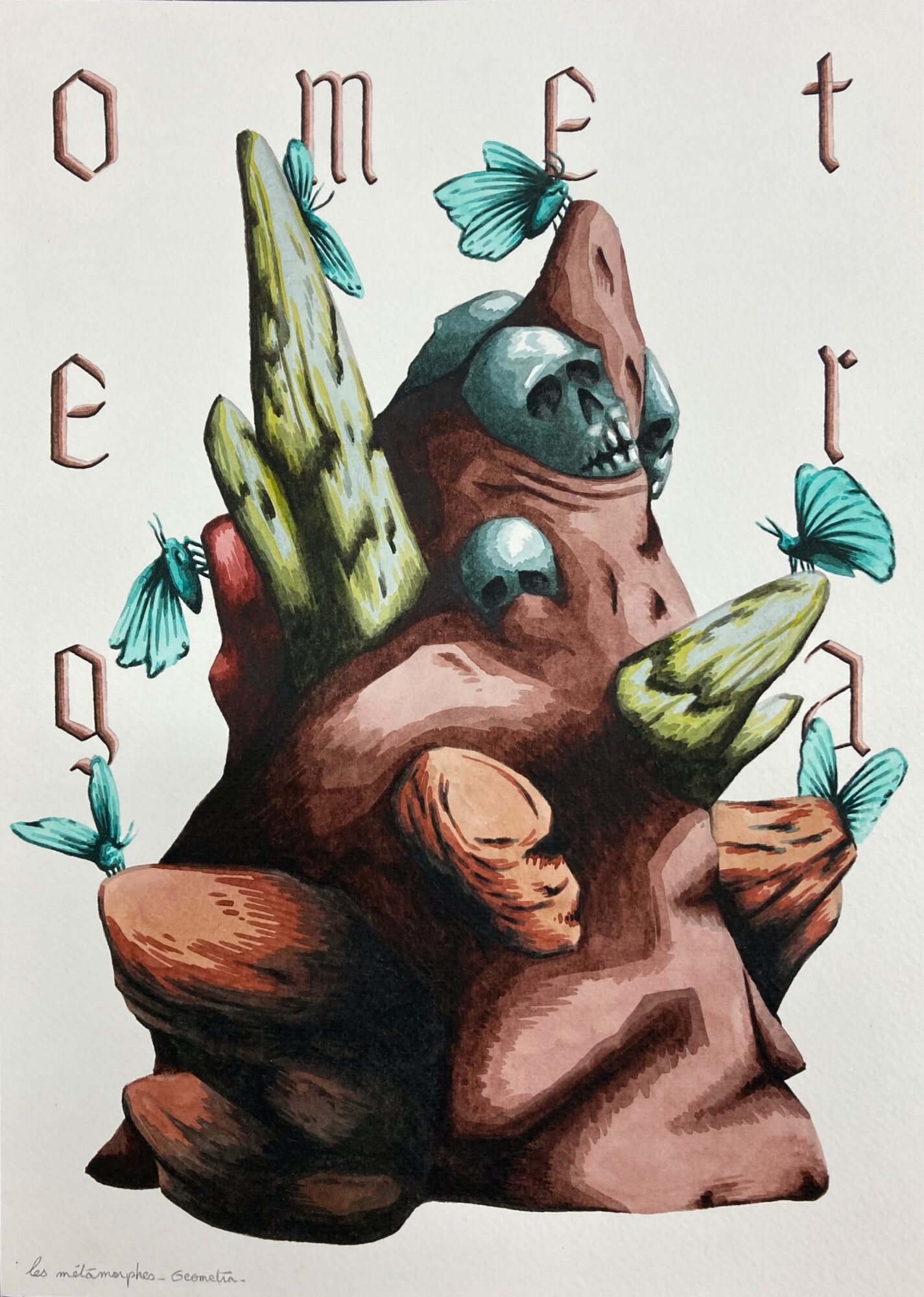 « Dans cette série de sept aquarelles – Les Méatamorphes –, Jimmy Richer cristallise des formes de vie en image et nous invite à regarder d’un œil neuf ce miracle de la métamorphose, entre alchimie et magie du vivant, qui a fasciné tant de naturalistes. Le métamorphe est généralement un être ayant la capacité de modifier son apparence physique, thème courant depuis l’Antiquité dans de nombreuses mythologies, religions, folklores, ainsi que dans la culture populaire moderne telle que la science-fiction et la fantasy. Avec sa dimension encyclopédique, cette série rassemble les connaissances afin de les transmettre et de les expliciter à la manière d’un codex. Anachroniques, ces dessins quasi surréalistes et fantastiques, entre enluminure, bande dessinée SF des années 1970 et planches d’ouvrages scientifiques, brouillent les pistes sur leur datation, créant une forme d’ambiguïté sinon d’anomalie, et, même une étrangeté qui avive notre soif de connaissances. »